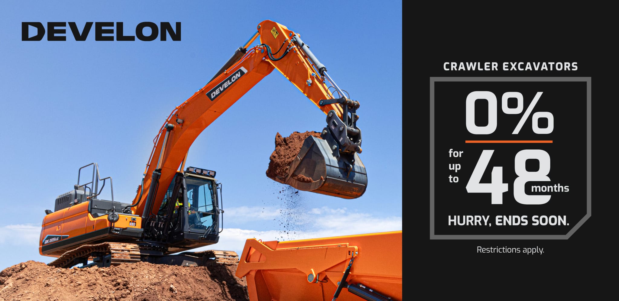 ● Flexible Financing: Get 0% financing for up to 48 months on DEVELON crawler excavators. ● Powerful Equipment: DEVELON excavators deliver the superior hydraulics needed for digging, loading trucks and more. ● Dedicated Support: Our equipment experts feel like they’re part of your team, offering responsive sales support and service to keep your jobs on schedule. Hurry, this 0% financing offer ends soon. Contact us today to schedule a demo.